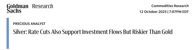 Goldman’s outlook envisions further medium-term gains in silver as Fed easing supports investment inflows, yet with pronounced volatility. Without the stabilizing force of central bank accumulation, silver’s price path will remain dependent on the behavior of ETF investors and the restoration of London liquidity. As we ha e stated several times: The easy money has been made. Now the big money can be made, but with much higher risk