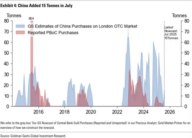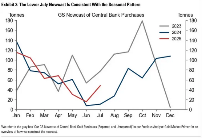 The July nowcast for central bank and institutional demand on the London OTC market came in at 48 tonnes, well below the 2025 monthly forecast of 80 tonnes. Goldman emphasizes that this shortfall is in line with a well-documented pattern. “Central bank purchases tend to slow in the summer and re-accelerate from September.”