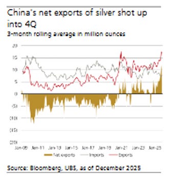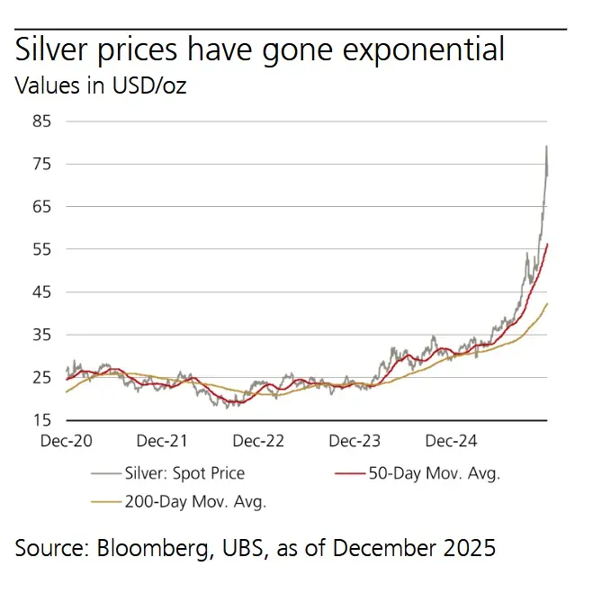 UBS says silver’s surge reflects physical deficits and policy risk, not financial excess. Export licensing in China and constrained mine supply are tightening markets, driving volatility. Gold continues to reprice on central-bank demand and macro uncertainty, with higher targets through 2026 before potential consolidation.