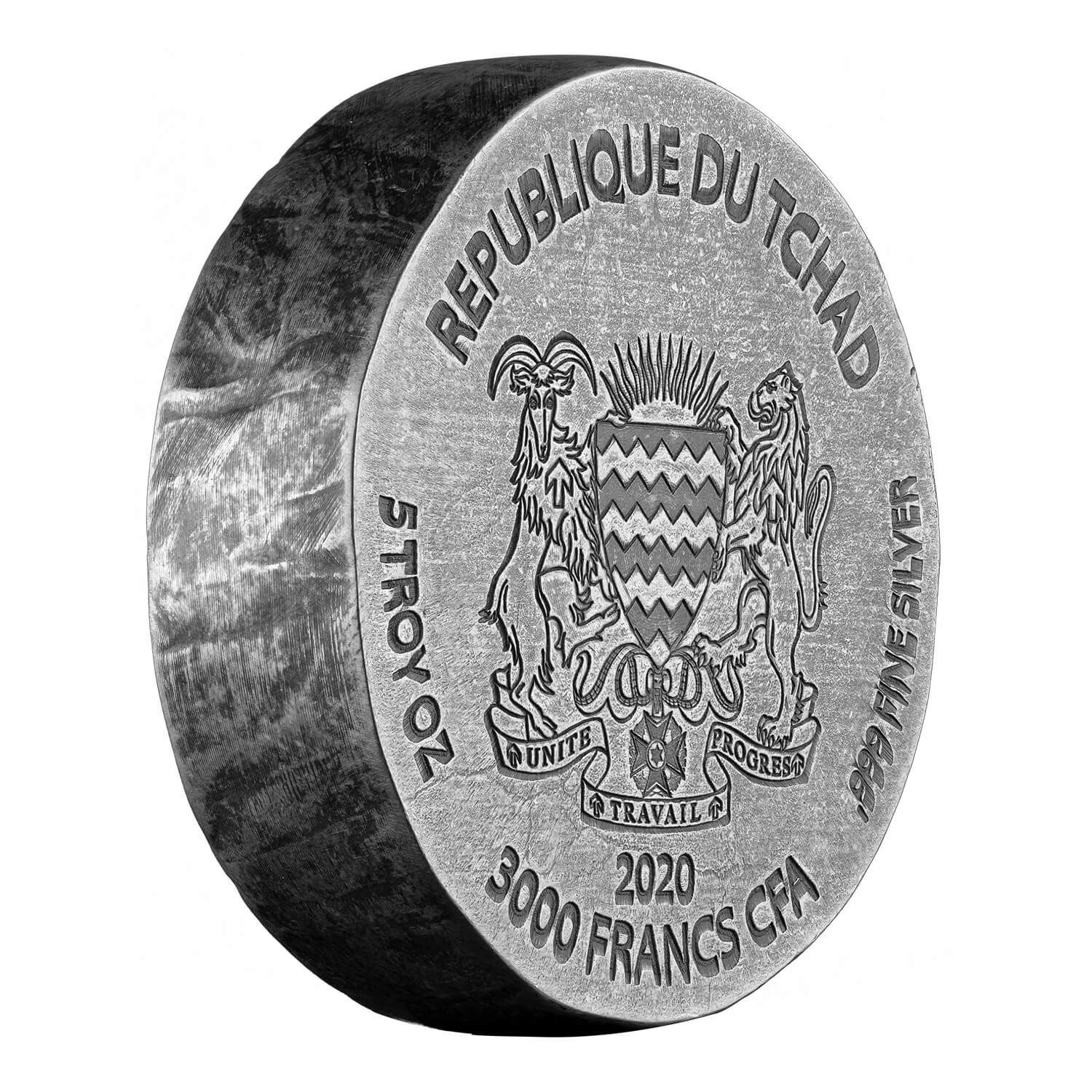 This legal tender bullion coin, inspired by ancient Hieroglyphics, is struck in .999+ silver, weighs 5 troy ounces and ships in a custom Egyptian Relic Series gift box.  The Republic of Chad 5 oz Queen Chariot of War coin features a hand-brushed antique finish with chiseled granite edge and is limited to a mintage of 5,000 pieces.