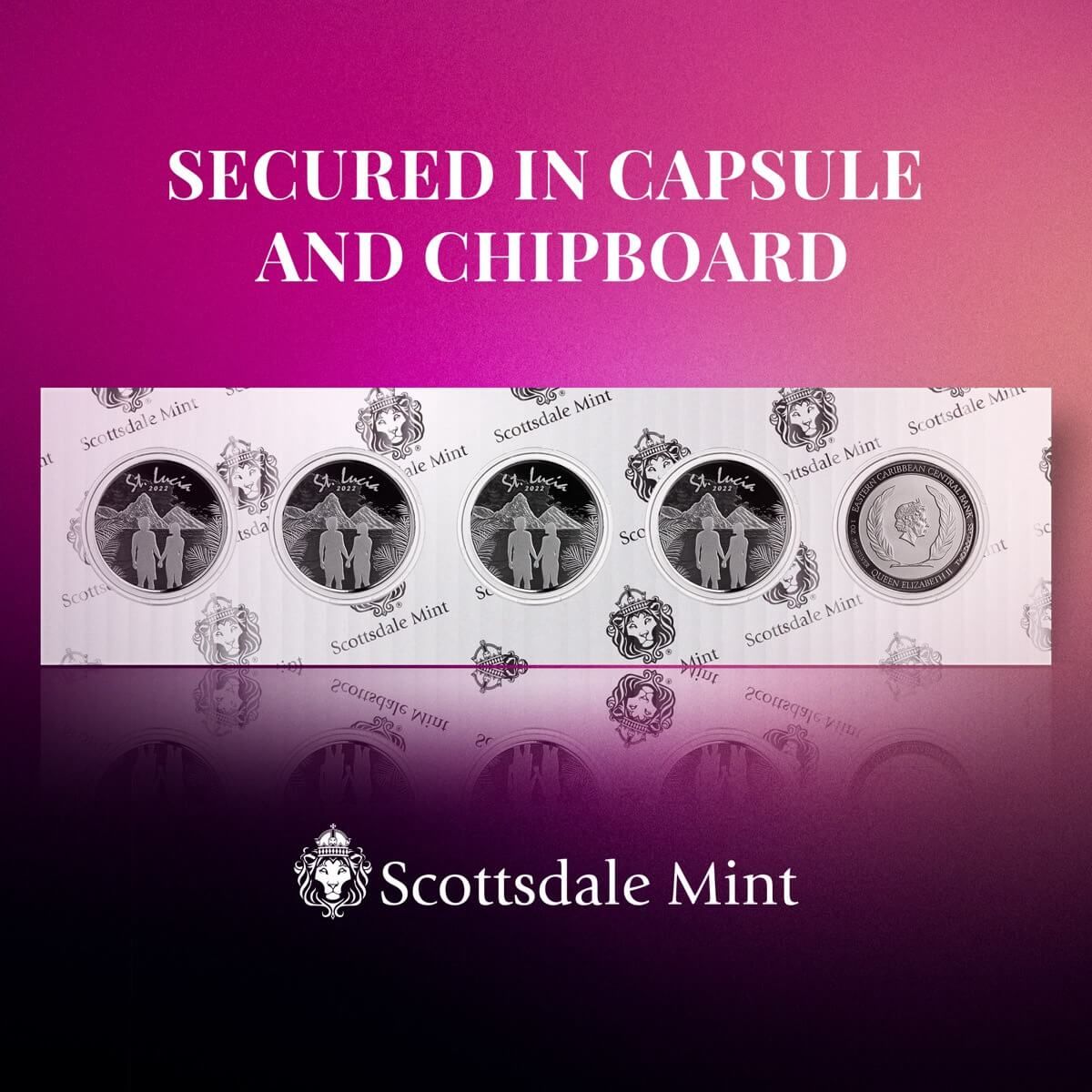Scottsdale Mint, in partnership with the Eastern Caribbean Central Bank (ECCB), is pleased to continue the EC8 program with the release of the 5th issue of St. Lucia Silver and Gold Coins.  Manufactured and distributed by Scottsdale Mint, each coin is struck in .999+ silver and .9999+ gold and weighs one troy ounce.