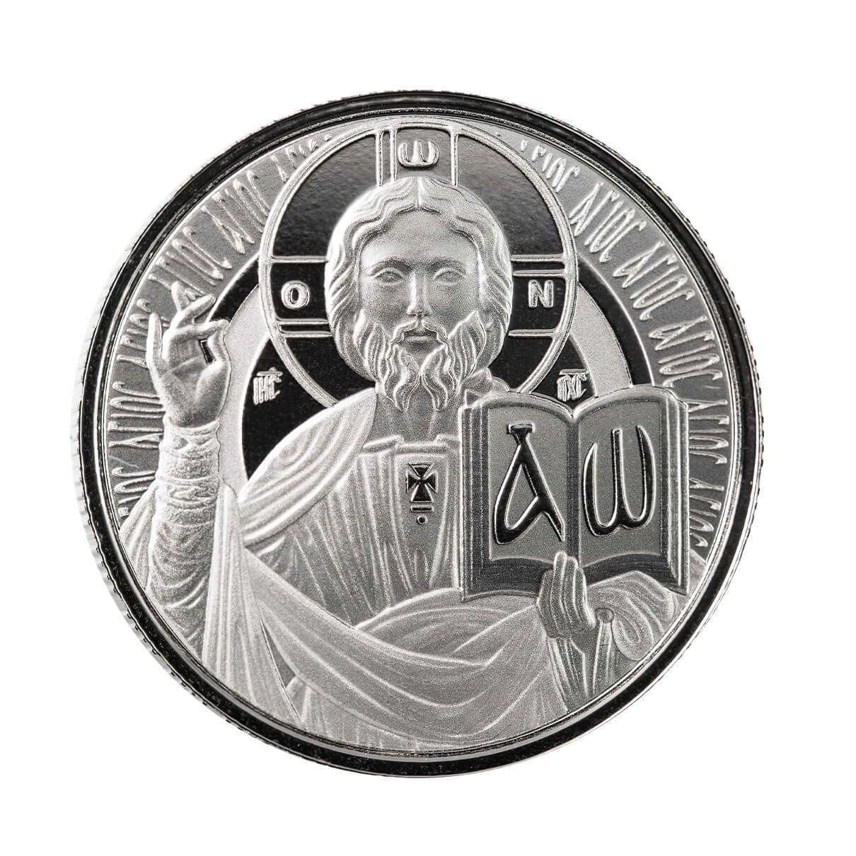 The coin features intricate details, with the word "HOLY - - Ô▓ÇÔ▓àÔ▓ôÔ▓ƒÔ▓Ñ - - AGIOS" inscribed. Notably, the Christ halo bears the meaningful inscription Ô▓×Ô▓░Ô▓Ü, signifying "THE Being." Positioned beside Christ, the initials of his name are delicately rendered: Ô▓ÆÔ▓ÄÔ▓ñ for Jesus and Ô▓áÔ▓¼Ô▓ñ for Christ. Additionally, the Bible on the coin is adorned with the symbolic representation of the Alpha and the Omega.
