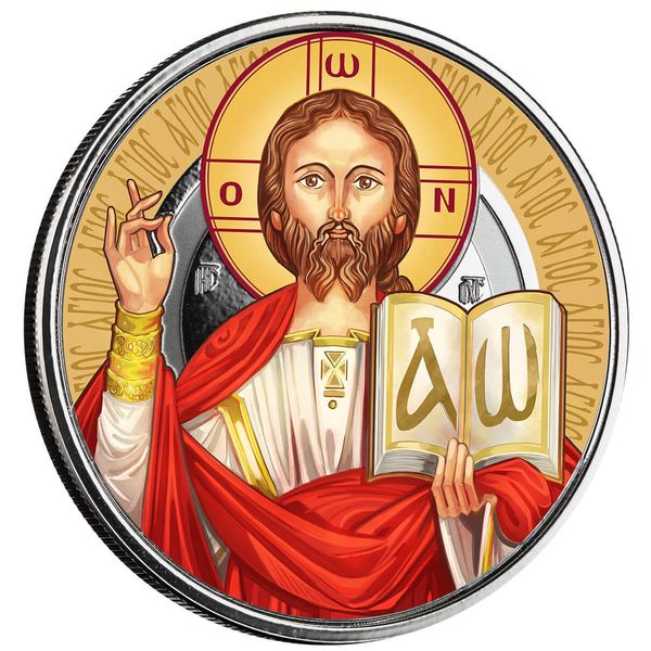The coin features intricate details, with the word "HOLY - - Ô▓ÇÔ▓àÔ▓ôÔ▓ƒÔ▓Ñ - - AGIOS" inscribed. Notably, the Christ halo bears the meaningful inscription Ô▓×Ô▓░Ô▓Ü, signifying "THE Being." Positioned beside Christ, the initials of his name are delicately rendered: Ô▓ÆÔ▓ÄÔ▓ñ for Jesus and Ô▓áÔ▓¼Ô▓ñ for Christ. Additionally, the Bible on the coin is adorned with the symbolic representation of the Alpha and the Omega.