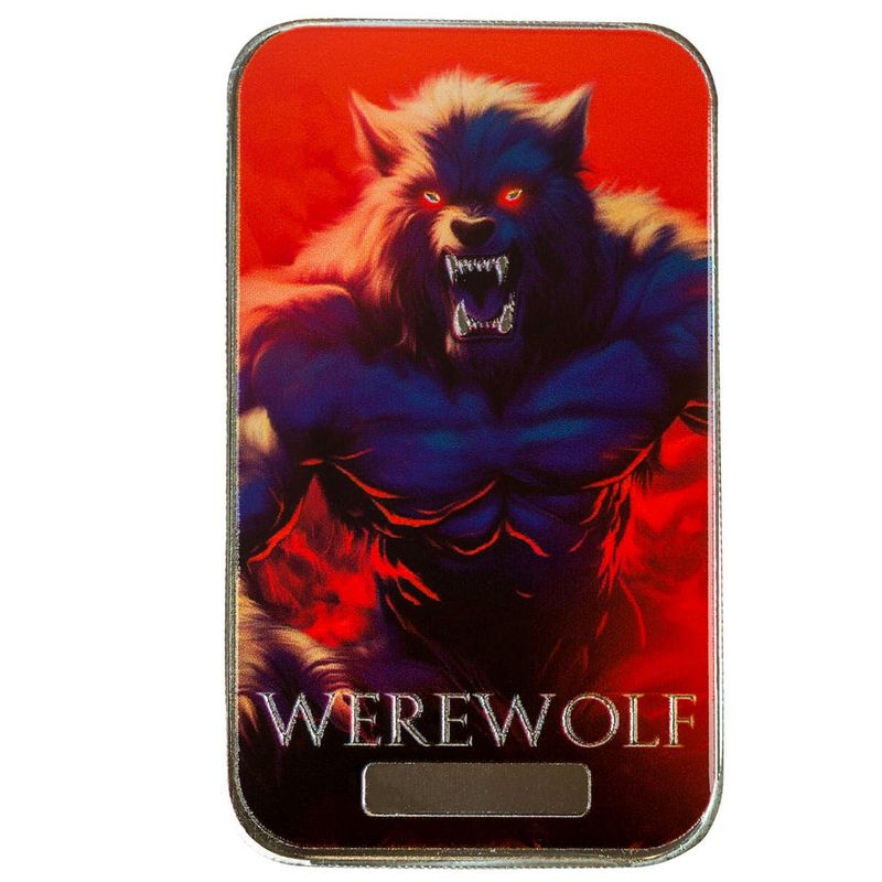 Embrace the howl of the full moon with the Werewolf 1 oz Silver Color Bar, an untamed addition to your treasure trove. The vivid portrayal of the werewolf mid-transformation, with piercing eyes and snarling fangs, captures the raw power and mystique of this legendary beast. Hues of silver and blue evoke the midnight sky, adding an extra layer of chilling allure. This .999 fine silver bar is perfect for those who relish the wild, untamed spirit of classic monster lore.