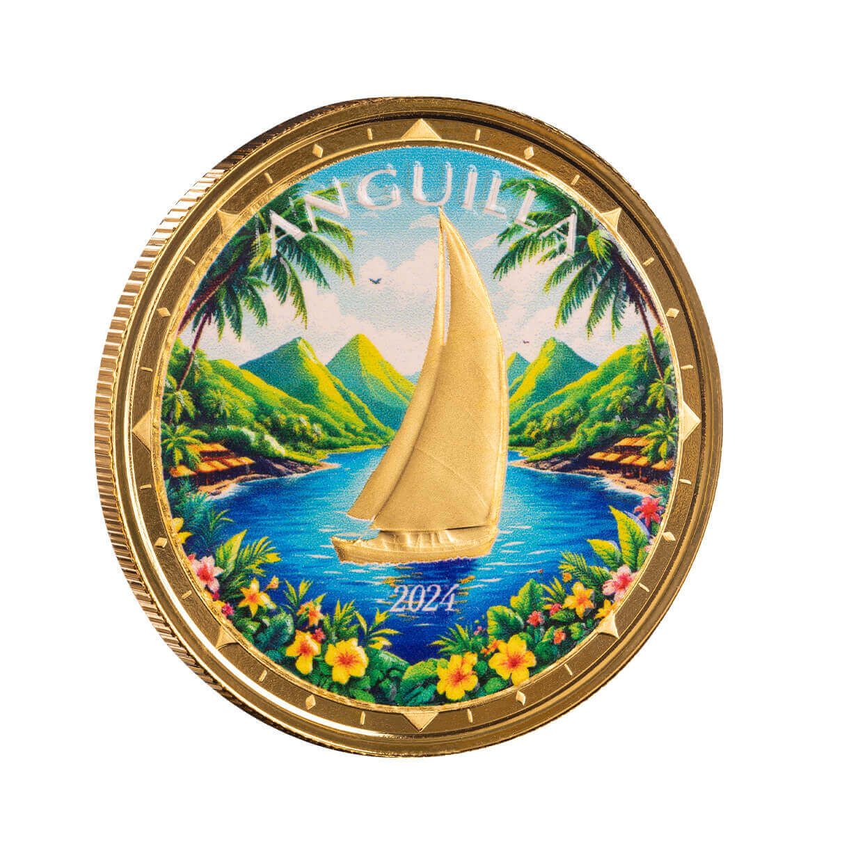 Glide into the heart of the Caribbean with a design that captures the quiet strength and enduring beauty of Anguilla’s nautical legacy. At its center is a single ship, alone on the open water, its sail full of wind, its course steady—an image that speaks to generations of craftsmanship, courage, and connection to the sea.