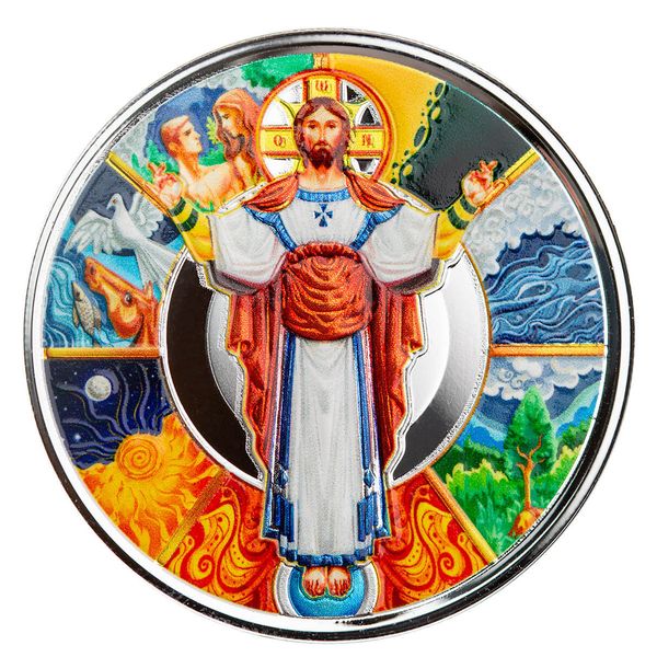 The design is further enriched with the inscription ÔÇ£HOLY - - Ô▓ÇÔ▓àÔ▓ôÔ▓ƒÔ▓Ñ - - AGIOS,ÔÇØ a testament to the sacredness of the act of creation. The coin also features the Alpha and Omega, symbolizing the eternal nature of Christ, the beginning and the end, through whom all was made. A radiant Christ halo bears the inscription Ô▓×Ô▓░Ô▓Ü, signifying "THE Being," affirming that He is the source and sustainer of all creation.