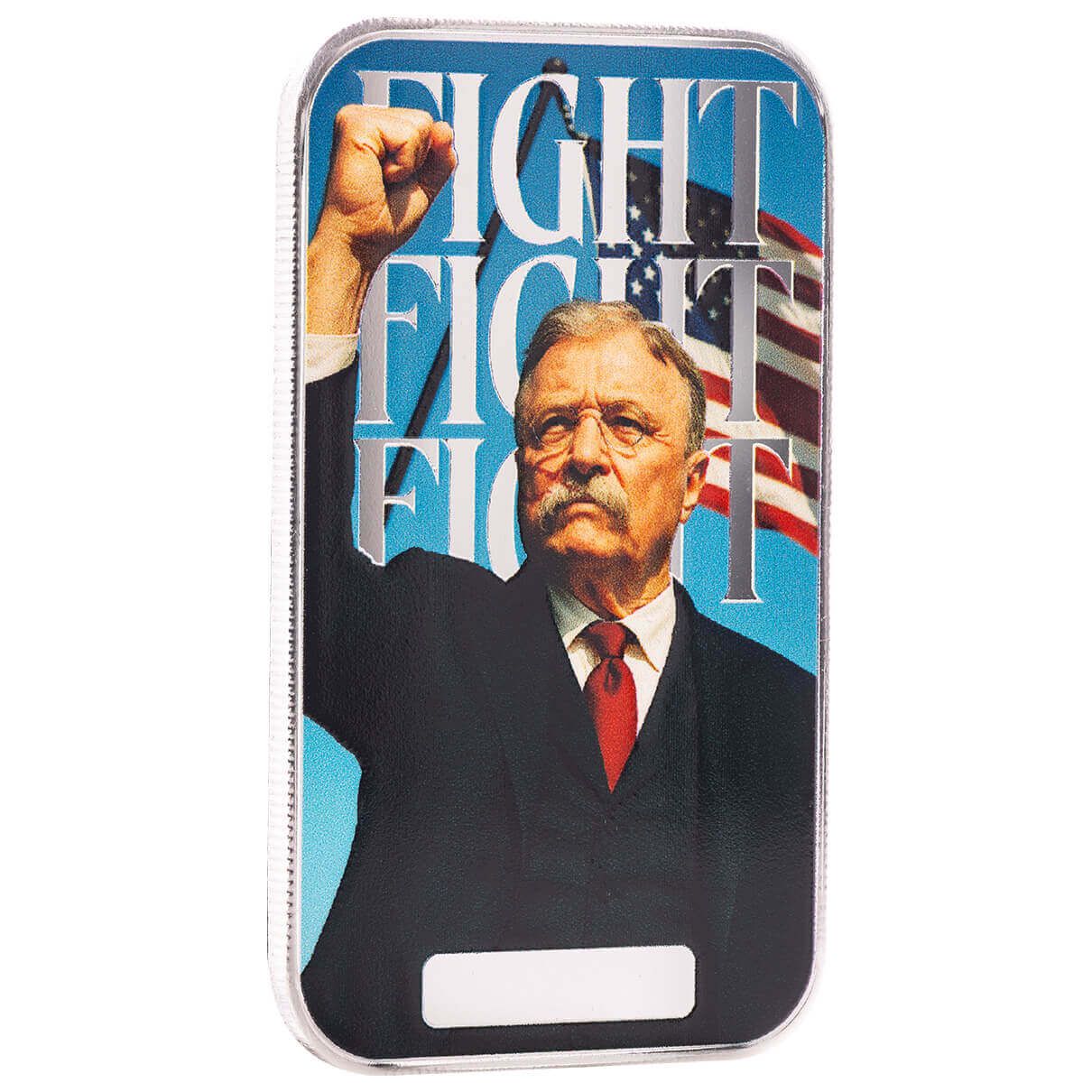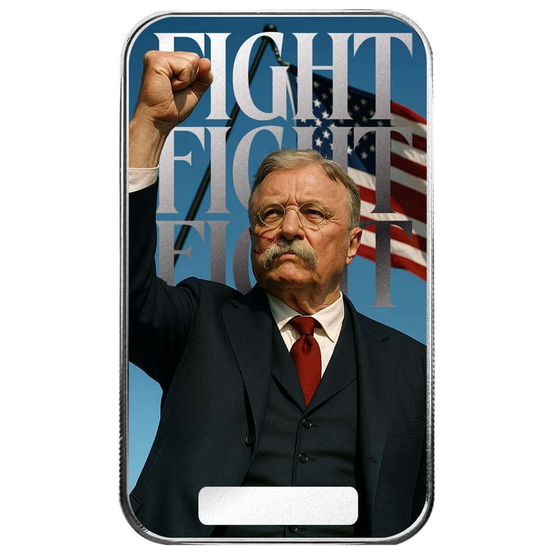 With his fist raised high and his stance unwavering, Theodore Roosevelt takes center stage in this powerful silver bar. Behind him, the bold words “Fight Fight Fight” blaze across the background like a call to arms. The scene channels one of the most legendary moments in Roosevelt’s life—when he was shot in the chest during a speech, yet stood tall and finished his remarks before seeking medical help.