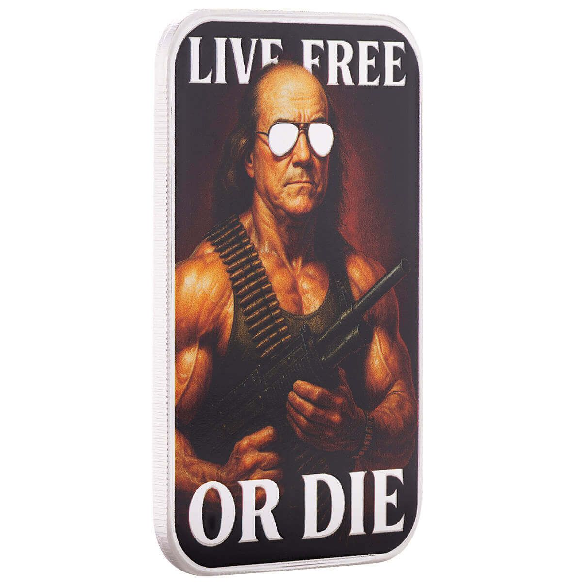 Founding Father meets modern muscle in this bold silver bar featuring Benjamin Franklin as you’ve never seen him—buff, confident, and rocking a pair of sunglasses. The phrase “Live Free or Die” rides atop the design, turning Franklin into a symbol of unapologetic freedom and strength.