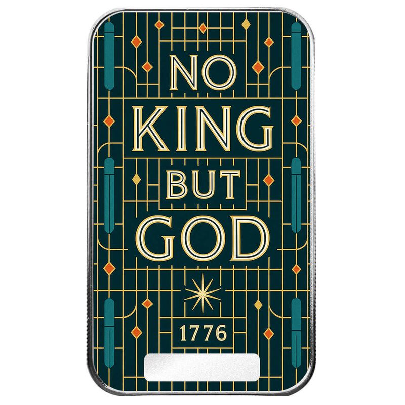 Set against an artistic wash of teal and blue, this elegant bar carries a bold message rooted in America’s founding faith: “No King But God.” The text, rendered in shining silver, is centered with quiet power—neither shouting nor whispering, but standing firm.