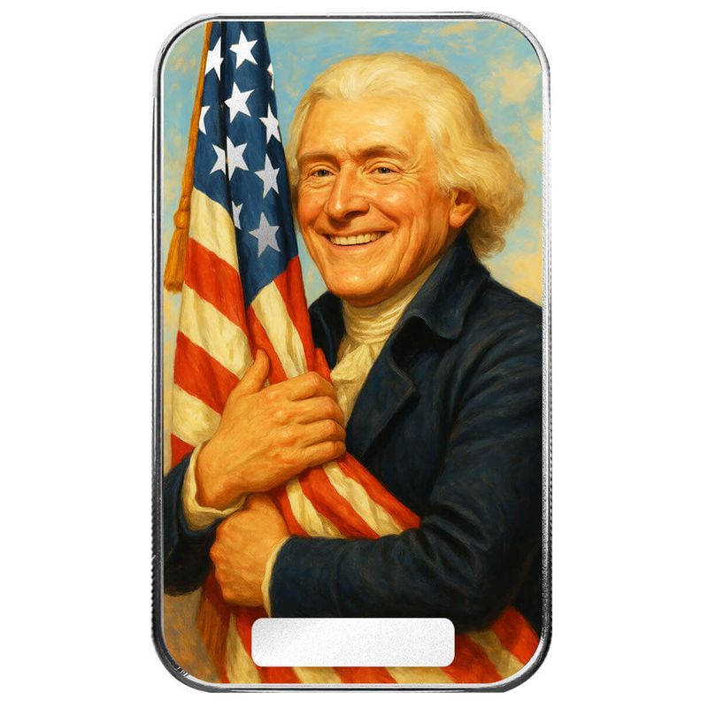 This tongue-in-cheek silver bar features Thomas Jefferson in a warm and awkwardly enthusiastic embrace with the American flag. Modeled in humorous style, the founding father’s exaggerated smile and overzealous hug add a layer of unexpected levity to one of history’s most serious figures.