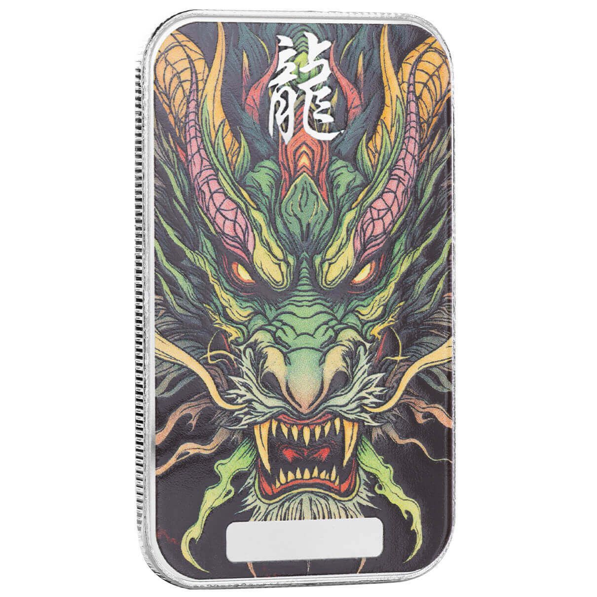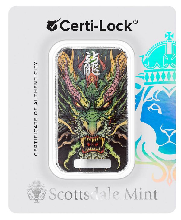 This 1 oz Silver Lucky Dragon Color Bar comes sealed in a serialized Certi-Lock®, offering stunning design and trusted authenticity. Featuring bold, intricate color detailing, the Lucky Dragon rises in full glory—an ancient symbol of prosperity, power, and protection.
