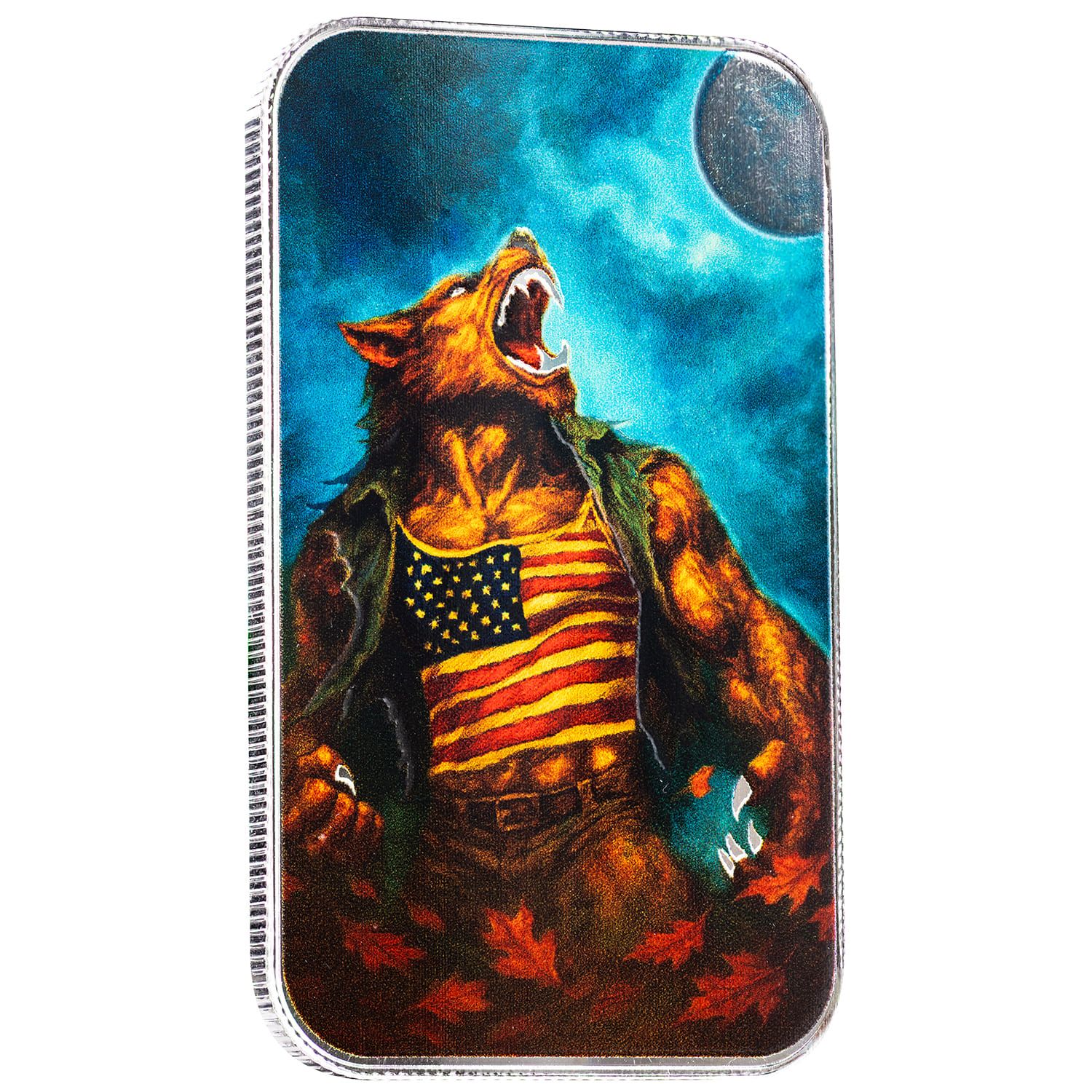 The 2025 American Werewolf 1 oz .999 Fine Silver Colorized Bar howls with patriotic ferocity. Featuring a feral werewolf clad in a torn vest emblazoned with the American flag, this piece blends supernatural lore with national pride. A full moon and autumn leaves set the stage for this striking design, enhanced by bold colorization.