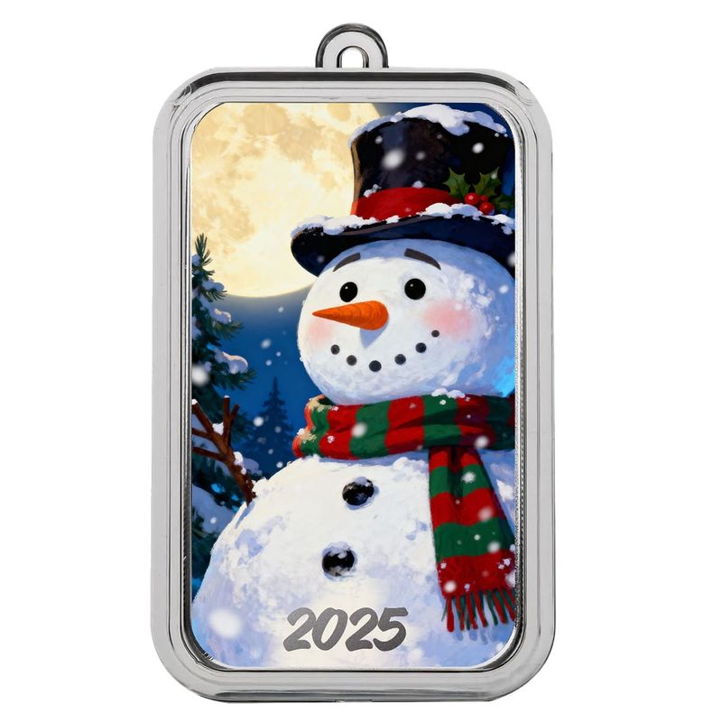 Celebrate the joy of the season with the 2025 Jolly Snowman – 1 oz .999 Fine Silver Colorized Bar. This heartwarming design captures the cheerful spirit of Christmas with a classic snowman standing proudly beneath a glowing full moon. Dressed in a black top hat, a red-and-green scarf, and a bright smile, this friendly figure embodies everything we love about winter — laughter, warmth, and the magic of the holidays.