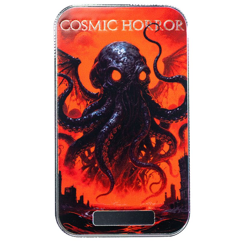Descend into the abyss with the 2025 Cosmic Horror 1 oz .999 Fine Silver Serialized Colorized Bar. This terrifying design channels the essence of Lovecraftian nightmares, depicting a monstrous tentacled entity rising from fiery seas beneath a blood-red sky. Its glowing eyes and sprawling form embody the fear of the unknown.