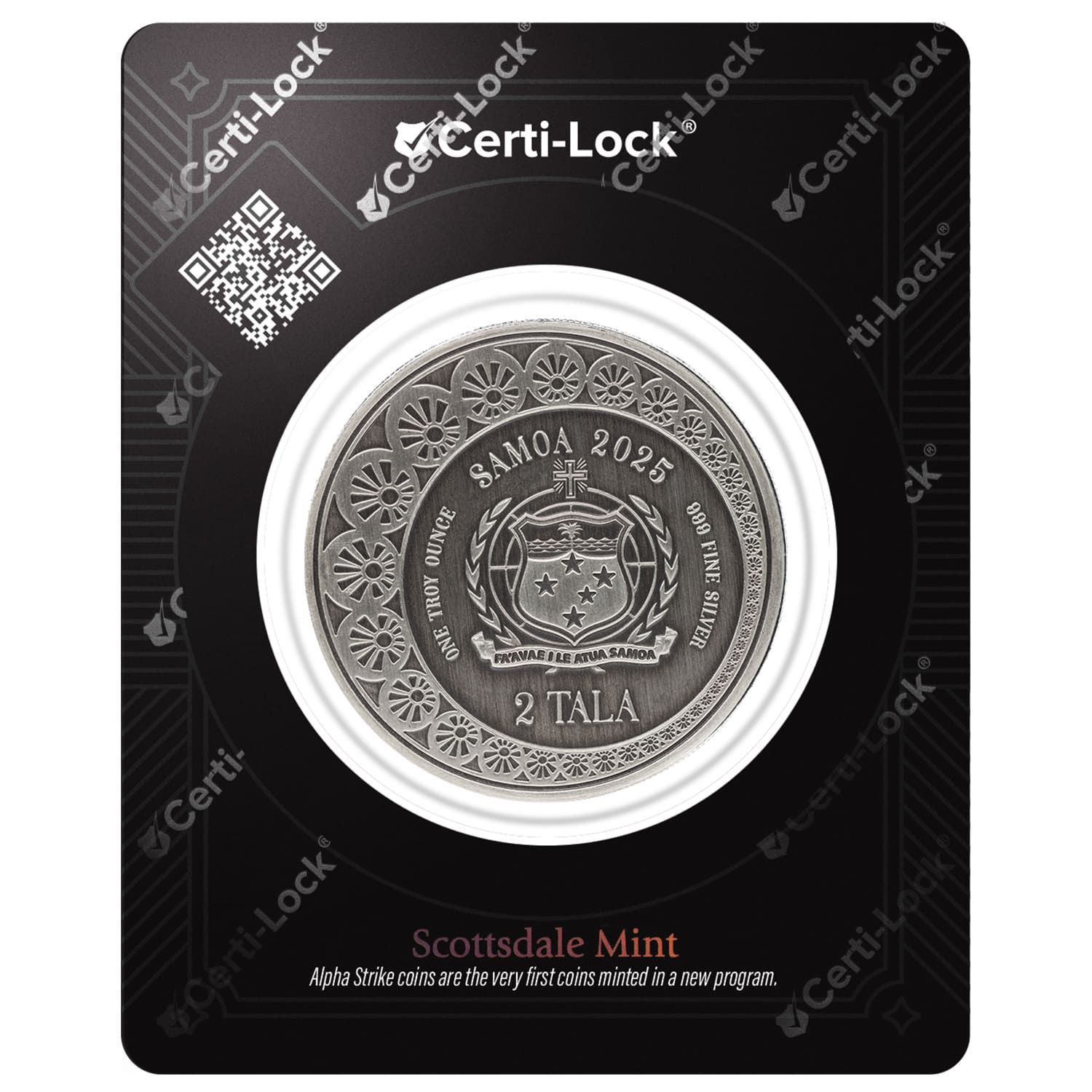 The reverse of the coin features the stunning mermaid in vivid detail, her fiery red hair and iridescent tail shimmering with vibrant color while she reaches for a radiant pearl. Contrasting blues and oranges create a sense of movement and magic, as though the coin itself were a window into an enchanted undersea world. The antiqued finish enhances the depth of the design, accentuating every swirl of water, strand of hair, and detail of the ocean’s coral backdrop. On the obverse, the official Samoa coat of arms affirms its authenticity and government-backed legal tender status.