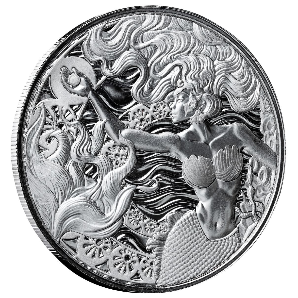 On the obverse, the coin features the official Samoa coat of arms, underscoring its status as legal tender. The reverse brings the underwater legend to life: a radiant mermaid with flowing hair reaches toward a glowing pearl, set against intricate waves and coral-inspired patterns. Each curve and engraving has been expertly struck to showcase the brilliance of silver in both proof-like brilliance and contrasting textures.