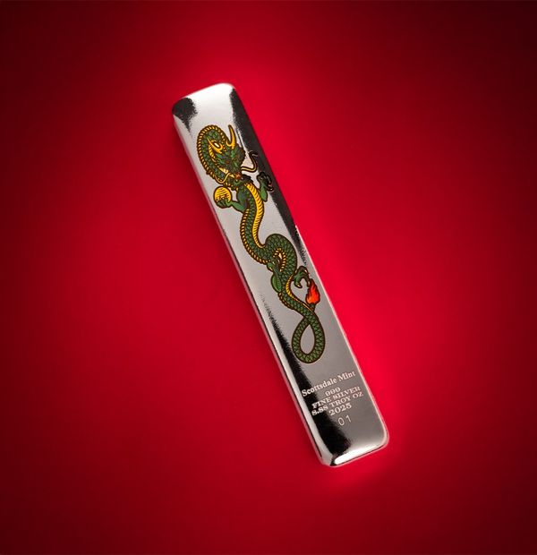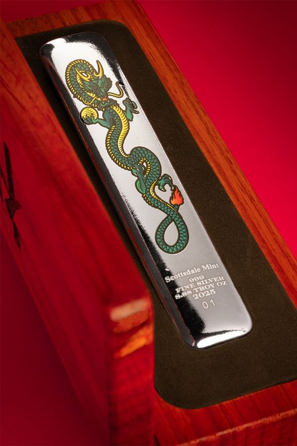 Now in its third year, the Scottsdale Mint Silver Lucky Dragon Bar returns as a stunning fusion of artistry, culture, and investment. Weighing an auspicious 8.88 troy ounces of .999 fine silver, this beautifully designed colorized bar embodies the essence of prosperity, wealth, and spiritual enlightenment, with the revered number 8 symbolizing great fortune in Chinese tradition.