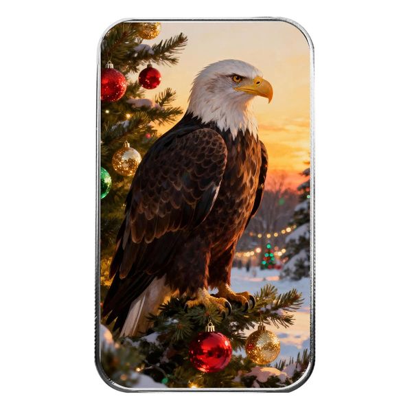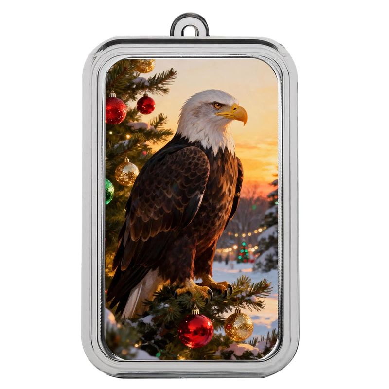 Celebrate the season with pride and purpose through the Patriotic Christmas – 1 oz .999 Fine Silver Colorized Bar. This inspiring design unites the spirit of Christmas with the strength of American heritage, featuring a majestic bald eagle perched proudly among the branches of a decorated Christmas tree. Ornaments of red, gold, and green shimmer beside the eagle’s snow-dusted feathers, while the soft glow of sunset lights the sky behind — a perfect balance of faith, freedom, and festivity.
