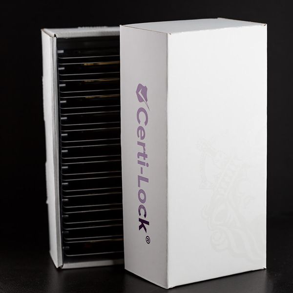 Store your Certi-Locked® gold and silver in an official Scottsdale Mint Certi-Lock® box. Each box can accommodate 25 Certi-Locked® items. Custom designed to the exact specs of Certi-Lock® cards for a perfect fit and constructed from high quality UV-coated chipboard, this elegant and robust organizational solution is shipped empty and ready for you to fill up. (To get one of these boxes for free, just order any Certi-Locked® products in increments of 25 at a time).