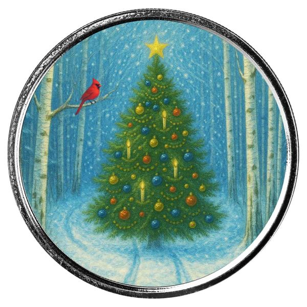 Celebrate the quiet beauty of winter and the warmth of the Christmas season with the Christmas Tree & Winter Cardinal – 1 oz .999 Fine Silver Colorized Round. This heartwarming design captures a glowing Christmas tree nestled in a snowy birch forest, its branches sparkling with ornaments and crowned by a radiant golden star. Two brilliant red cardinals perch nearby, their vivid plumage glowing against the cool tones of snow and sky — a symbol of hope, love, and the presence of cherished ones during the holidays.