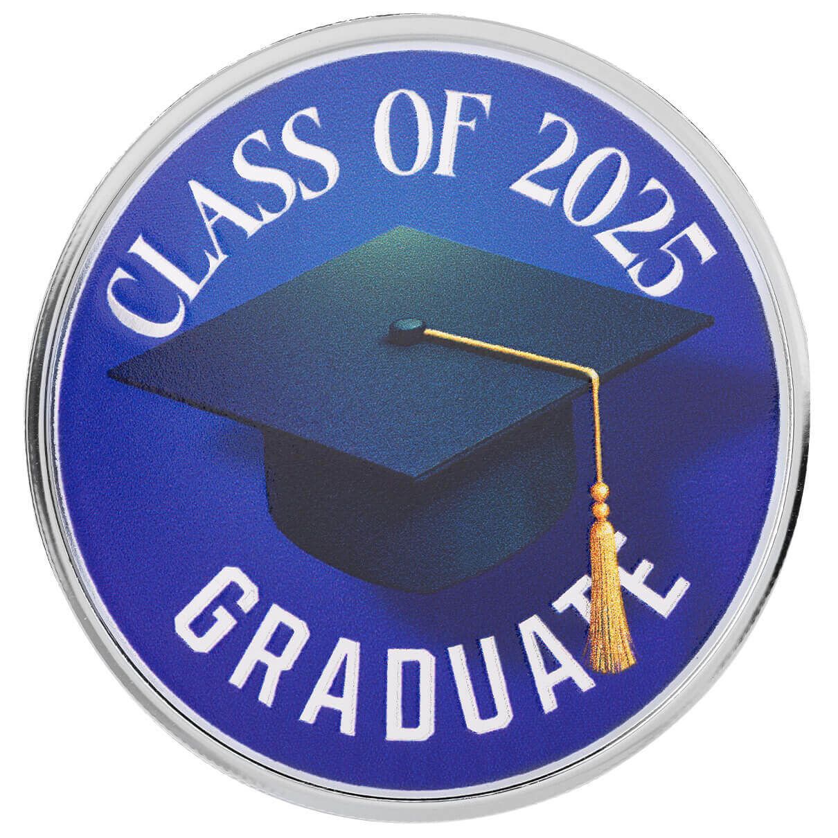 This classic silver round showcases a bold navy background and matching graduation cap, paired with the words “Class of 2025 Graduate.” The deep, rich tones give the design a sleek and dignified look, making it a timeless tribute to academic success. A meaningful keepsake for graduates of all levels, this round marks the moment with elegance and pride.