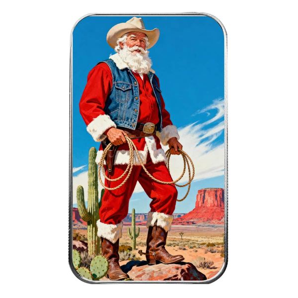 Saddle up for a Southwestern Christmas with the Cowboy Santa – 1 oz .999 Fine Silver Colorized Bar. This bold and festive design gives Saint Nick a rugged western twist, depicting him standing proudly under the bright desert sky. Dressed in his red suit, denim vest, and cowboy boots, with a coiled lasso in hand, Santa trades snow for sand and sleigh bells for spurs — ready to spread Christmas cheer across the open range.