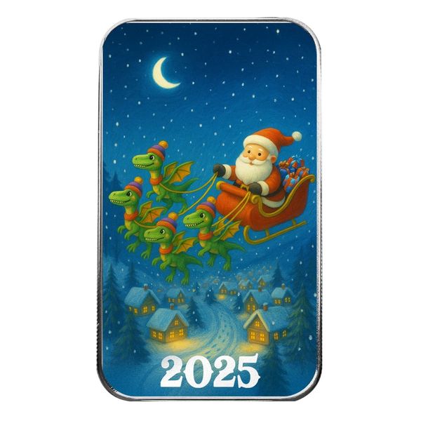 Take your Christmas collection on a prehistoric adventure with the Dinosaur Sleigh Ride – 1 oz .999 Fine Silver Bar. This playful and imaginative design reimagines Santa’s classic sleigh ride in the most unexpected way — with a team of bright green dinosaurs pulling his sleigh through a starry winter sky. Santa holds the reins with a joyful grin, his sack of gifts flying behind him as snowflakes swirl below. It’s a whimsical and unforgettable twist on Christmas tradition that brings smiles to both the young and the young at heart.