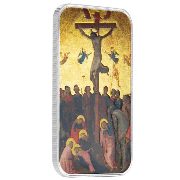 This solemn 1 oz silver color bar features The Crucifixion, by the artwork of Fra Angelico. Christ hangs upon the cross, His form illuminated by a divine glow, capturing the depth of His sacrifice. The intricate details bring forth the moment's emotion—His outstretched arms, the sorrowful yet reverent expression, and the dramatic interplay of light and shadow. This piece serves as a powerful reminder of faith, redemption, and the ultimate act of love. A profound addition to any sacred collection.