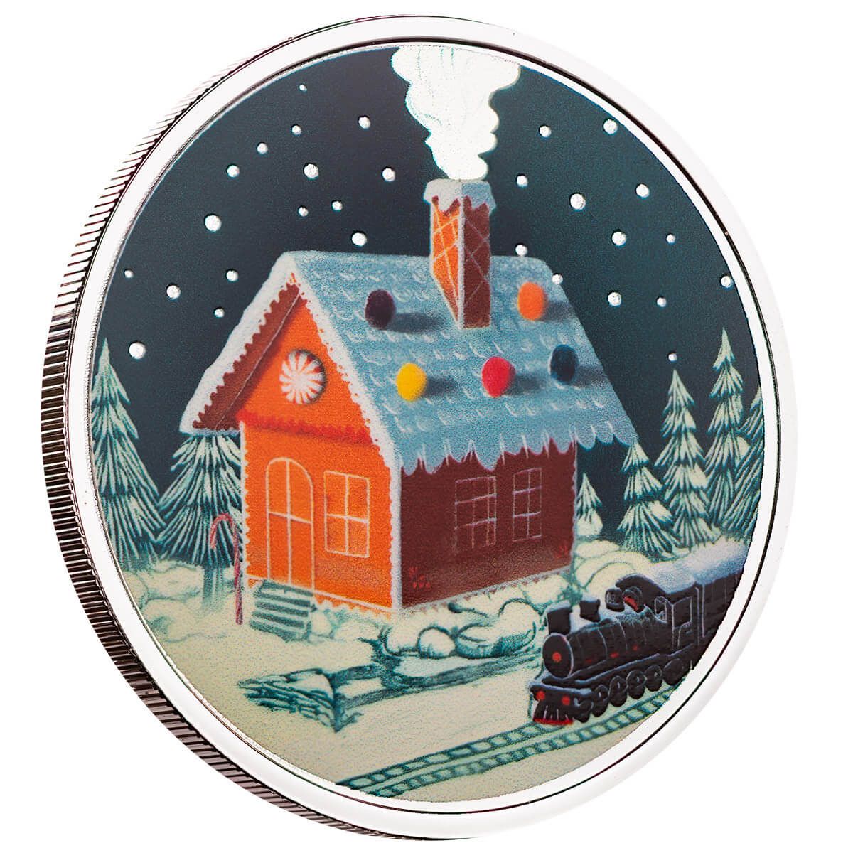 Celebrate the magic of the holiday season with this enchanting 1 oz silver color round, showcasing a cozy gingerbread house nestled in a winter wonderland. The house is adorned with frosted icing details, candy cane decor, and gumdrop accents, with a curl of smoke rising from its chimney, giving the scene a warm, inviting feel. In front of the house, a charming toy train chugs along, adding a playful touch as it winds through the snowy landscape. The dark, starry sky above enhances the cozy glow of the gingerbread house, making this a perfect holiday keepsake.