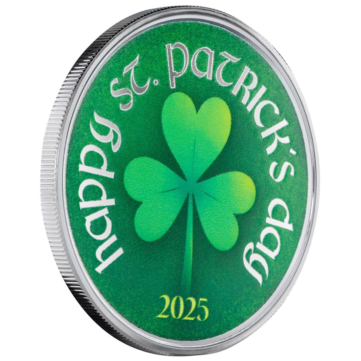 Whether youÔÇÖre commemorating this yearÔÇÖs holiday or adding a meaningful piece to your collection, this "Happy St. PatrickÔÇÖs Day" round is a great way to keep the spirit of the season alive. ItÔÇÖs a fantastic gift or keepsake to mark 2025 and the joyful energy of St. PatrickÔÇÖs Day!