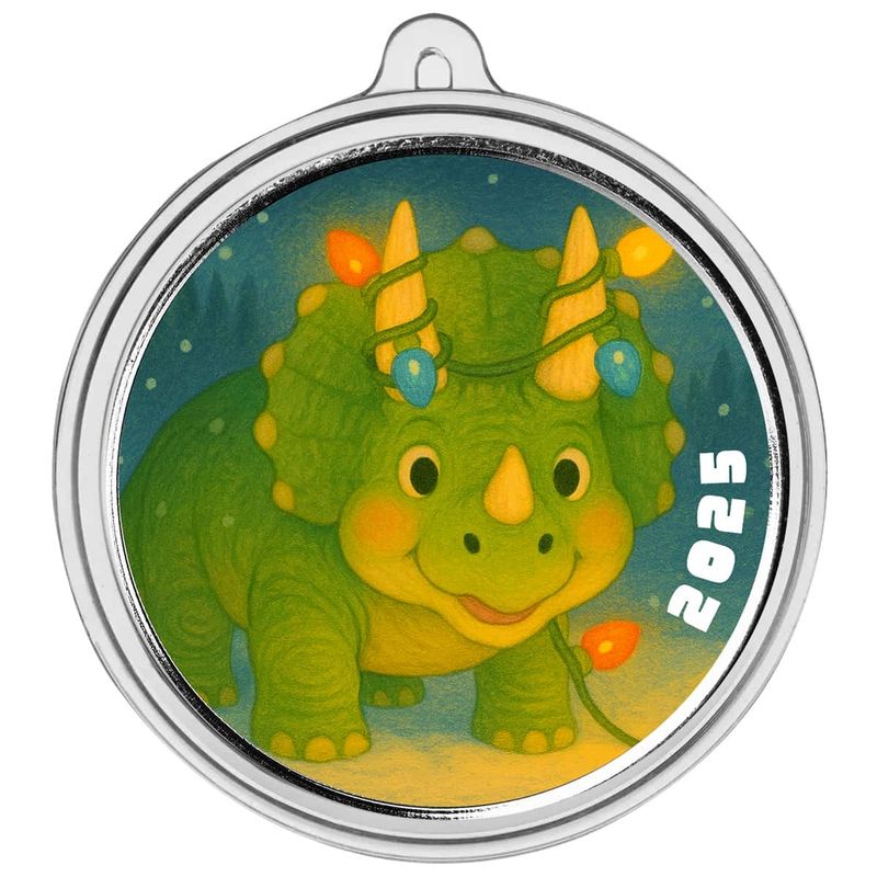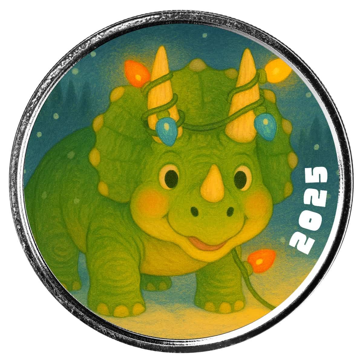 Add a playful touch of holiday cheer to your collection with the Holiday Dinosaur – 2025 1 oz .999 Fine Silver Round. This whimsical design features an adorable green Triceratops enjoying the season, holding a string of colorful Christmas lights in its mouth. Surrounded by a snowy winter backdrop, this cheerful holiday collectible brings together the joy of Christmas with the fun of prehistoric imagination, making it a perfect keepsake for both children and adults alike.