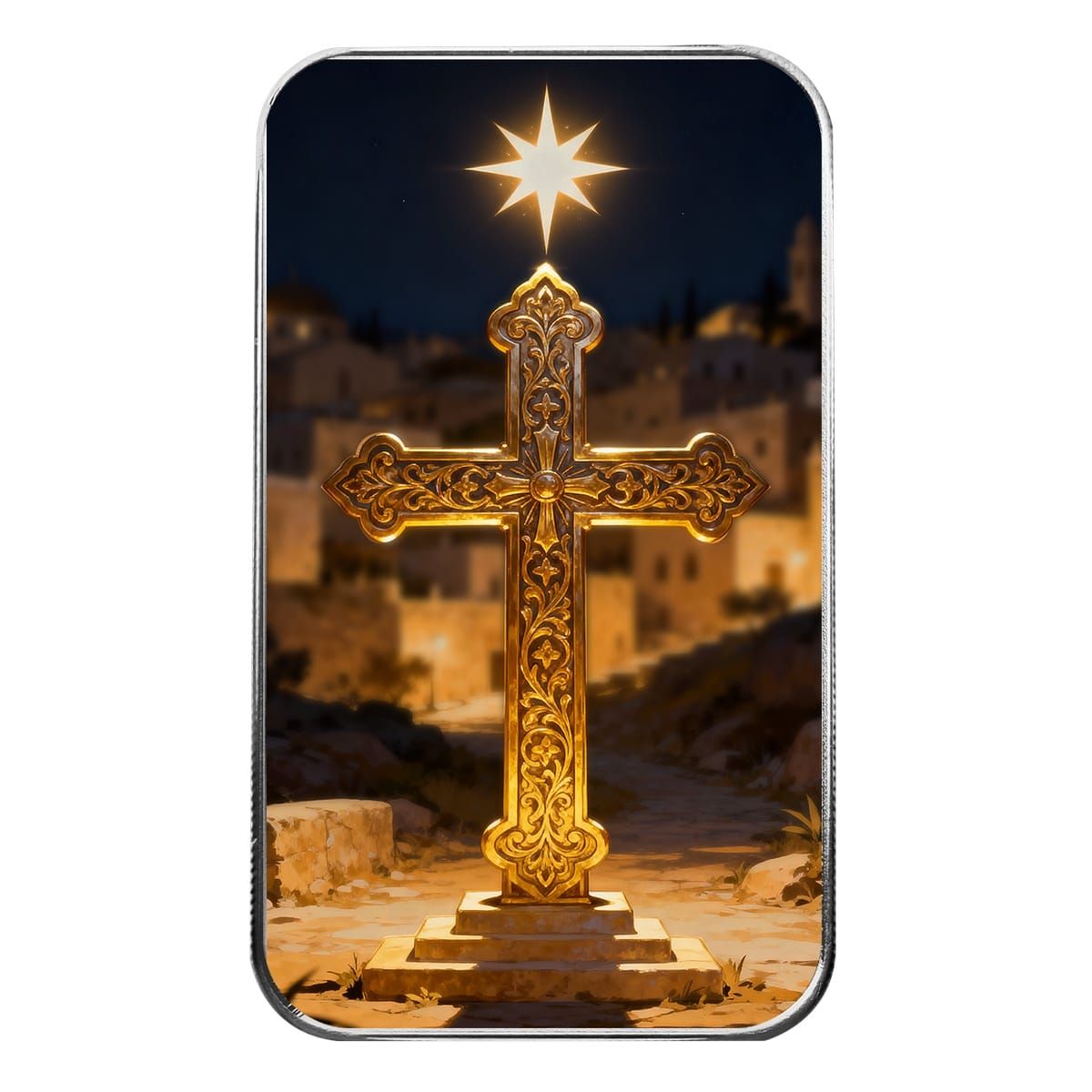 Honor the true meaning of Christmas with the Holy Night Cross – 1 oz .999 Fine Silver Colorized Bar. This breathtaking design depicts a beautifully ornate cross standing beneath the radiant Star of Bethlehem, shining over a quiet village at night. The golden glow of the star illuminates the intricate details of the cross and the stone pathway below, symbolizing faith, guidance, and the divine light that led the world to hope on that first holy night.