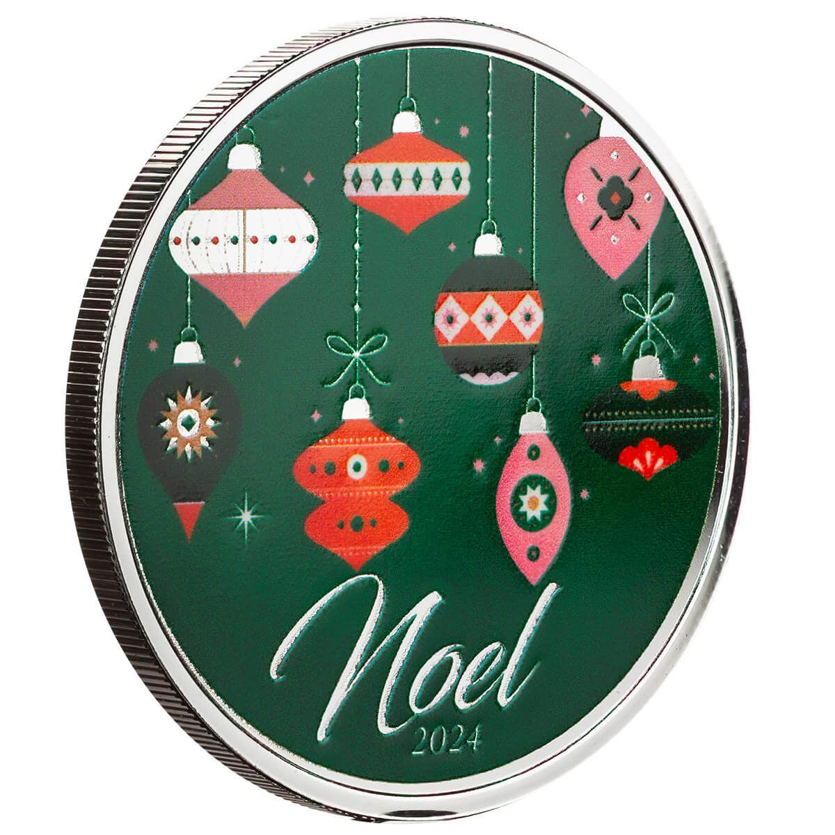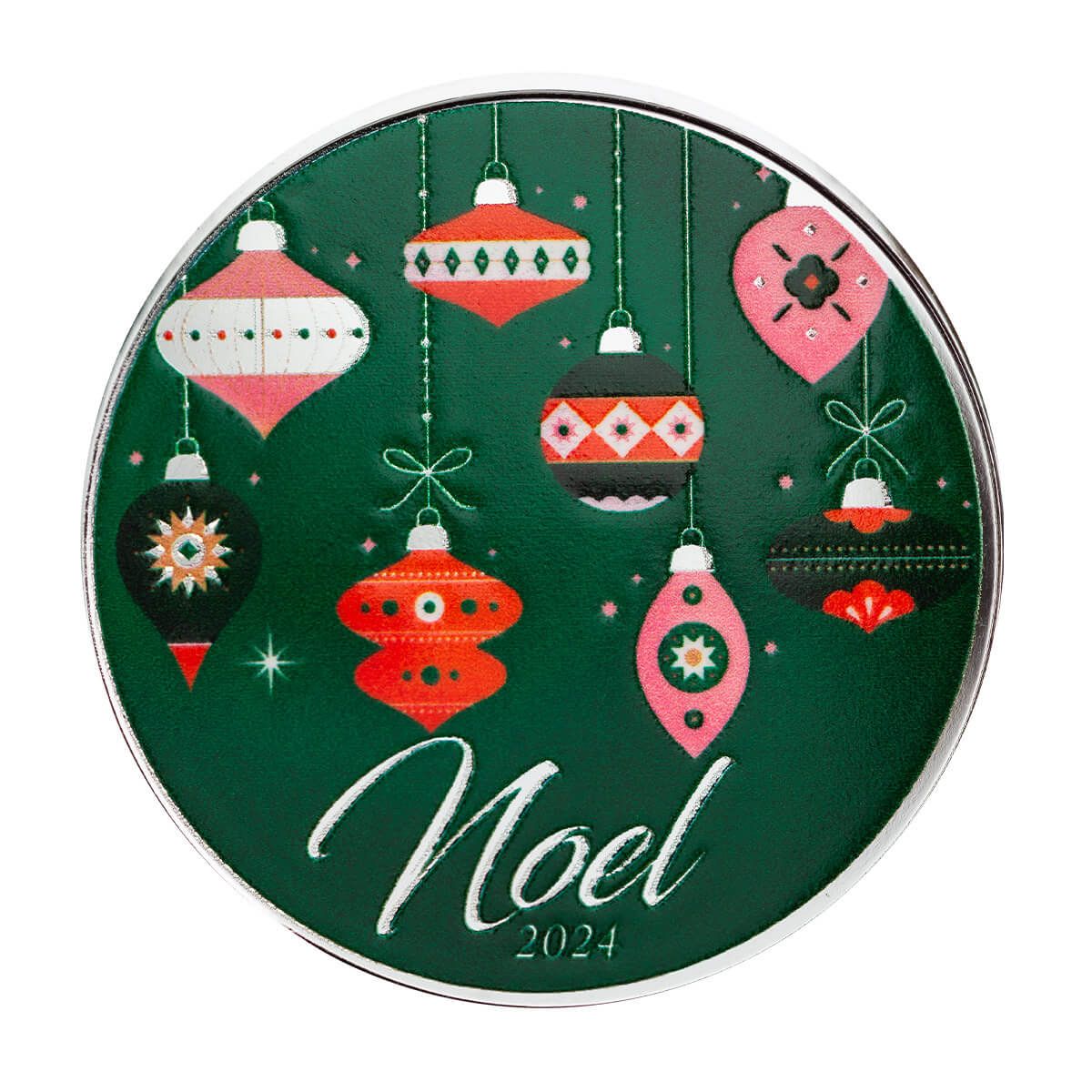The Noel Ornaments 1 oz Silver Round showcases a festive design that perfectly encapsulates the joy of the holiday season. Featuring playful ornaments delicately hanging against a vibrant green backdrop, this round brings a sense of whimsy and cheer to your holiday celebrations. The word "Noel" boldly stands out in the forefront, embodying the spirit of Christmas and the warmth of gathering with loved ones. Crafted from 1 oz of pure silver, this piece combines delightful artistry with the enduring value of silver, making it an ideal gift or a charming addition to your collection. Celebrate the essence of the season with this joyful tribute to holiday festivities!