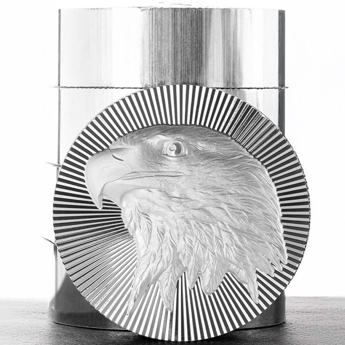 The expanded surface area of the 5 oz format intensifies the ultra-high relief detailing, giving the bald eagle portrait remarkable depth and shadow. Every feather, curve, and contour gains amplified dimension, resulting in a dramatic three-dimensional effect that distinguishes this piece from traditional large-format silver rounds.