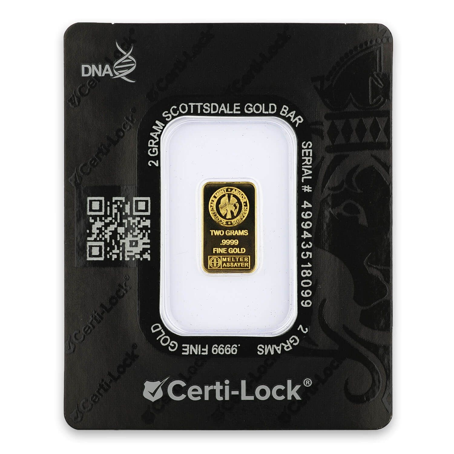 2 gram .9999 gold bar by Scottsdale Mint. Sealed in secure Certi-Lock packaging for serialized authenticity.