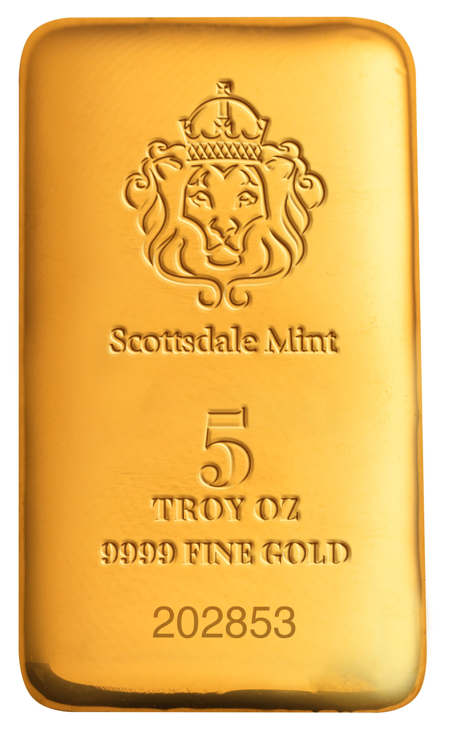 Invest in excellence with the Scottsdale Mint 5 Troy Ounce Gold Cast Bar. Each bar contains exactly 5 troy ounces (155.5 grams) of 9999 fine goldÔÇöthe highest purity standard in the precious metals industry.