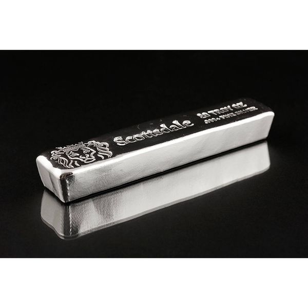 Beautiful cast silver bullion bar in an extra-long format. Twenty troy ounces of .999 pure silver with trapezoidal cross section and highly reflective surfaces. This is the Scottsdale CL20.