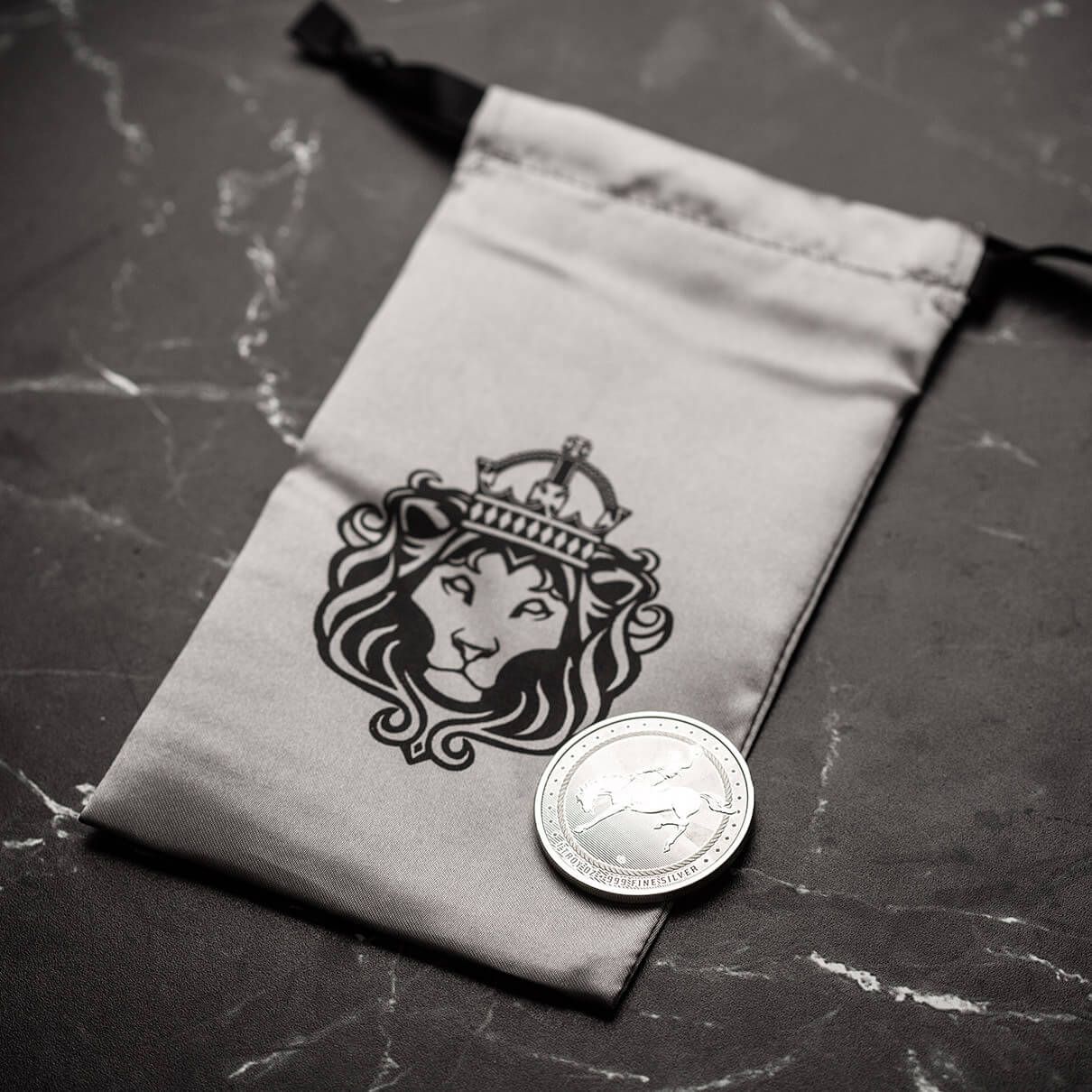 Silver Silk bag featuring the Scottsdale Mint Lion hallmark, suitable for silver and gold bullion and coin storage. This gift bag is just the right size for gifting larger bullion bars like our CL20. The internal large bag dimensions are: 4 x 7 inches.