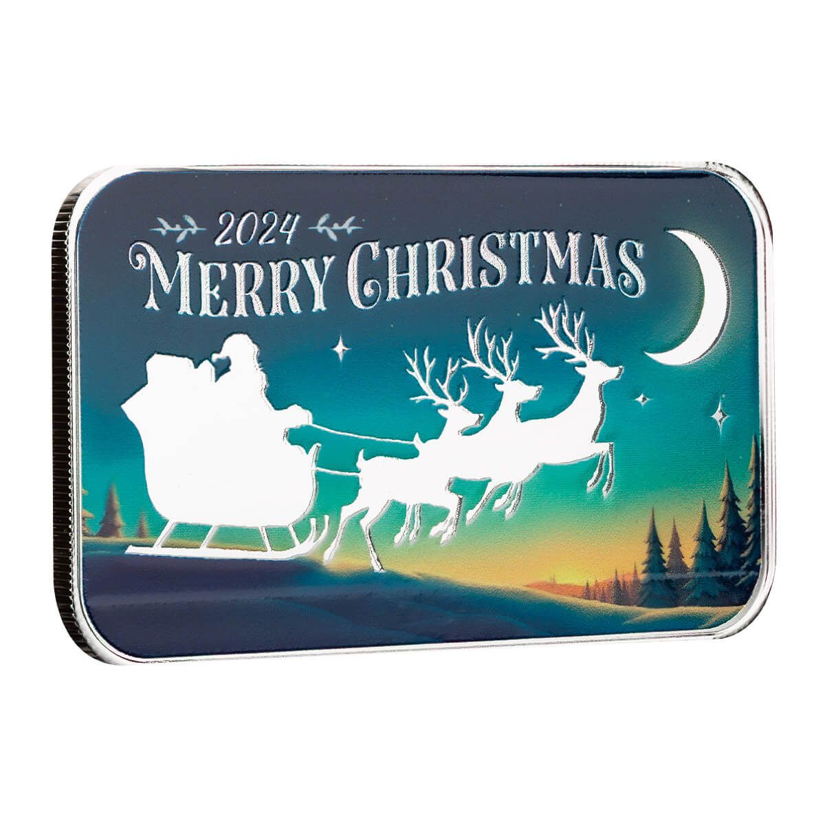 This bar captures the magical moment of Santa taking off with his reindeer into a stunning sunset sky. Against a backdrop of soft hues blending into warm oranges, the silhouette of Santa and his trusty reindeer evokes a sense of wonder and excitement as they embark on their Christmas journey. Snow all around them, adding a festive touch to this enchanting scene. Crafted from 1 oz of pure silver, this bar combines artistry with the precious metal, making it a perfect gift or collectible. Celebrate the spirit of the season with this delightful depiction of Christmas Eve magic!
