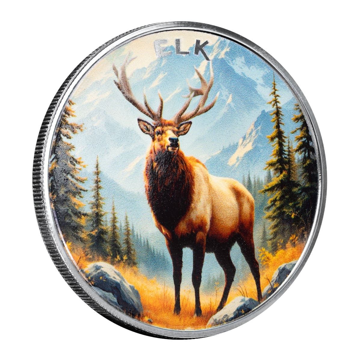 The obverse depicts a bull elk in full antler, standing in a rugged mountain wilderness. The vivid colorization brings the scene to life, capturing the natural beauty and power of this legendary game animal.